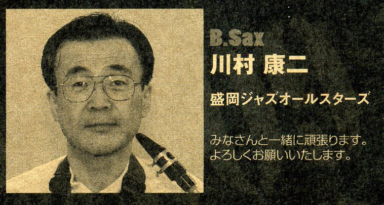 | 岩手の社会人・大学生のメンバーで「いわてJAZZ 2009スペシャルバンド」と銘うったジャズビッグバンドを編成し ピックアップメンバーに、盛岡ジャズオールスターズ(代表 作山 篤 新25回生)より石桜同窓生の 戸塚孝徳(新21回生) 工藤 清人(新22回生) 川村 康二(新24回生) 作山 篤(新25回生) の4人が出演し熱演しました。 |