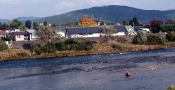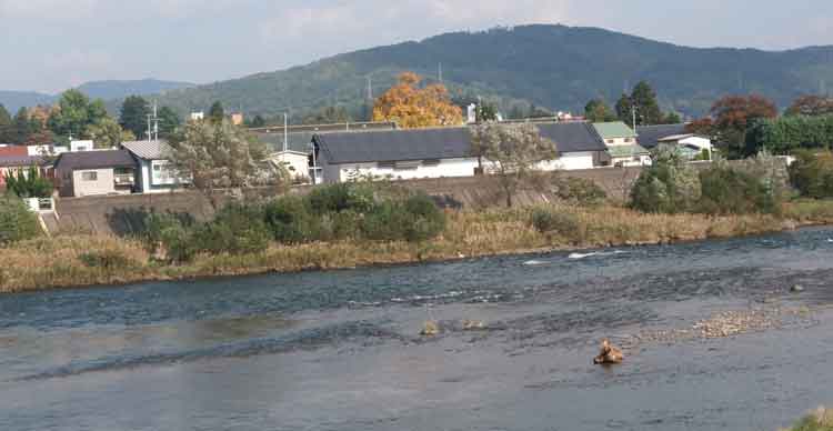明治は橋を仙北町方面から渡って行くと北上川下流のコンクリート護岸越しに鮮やかな白壁の土蔵が目に入る。 |