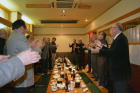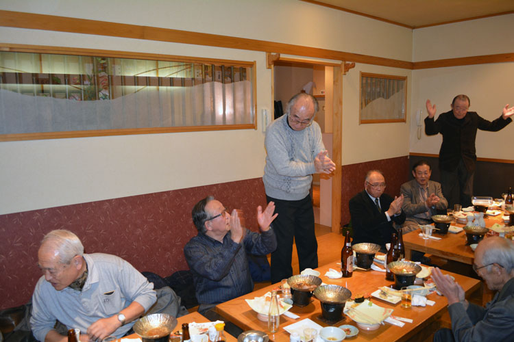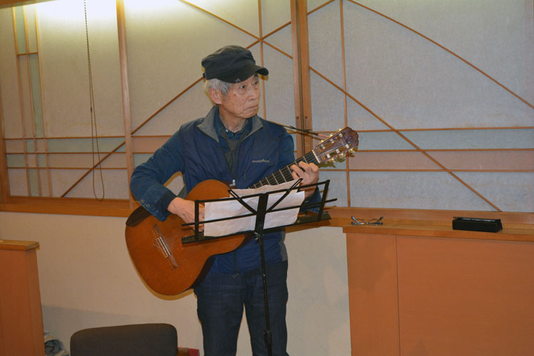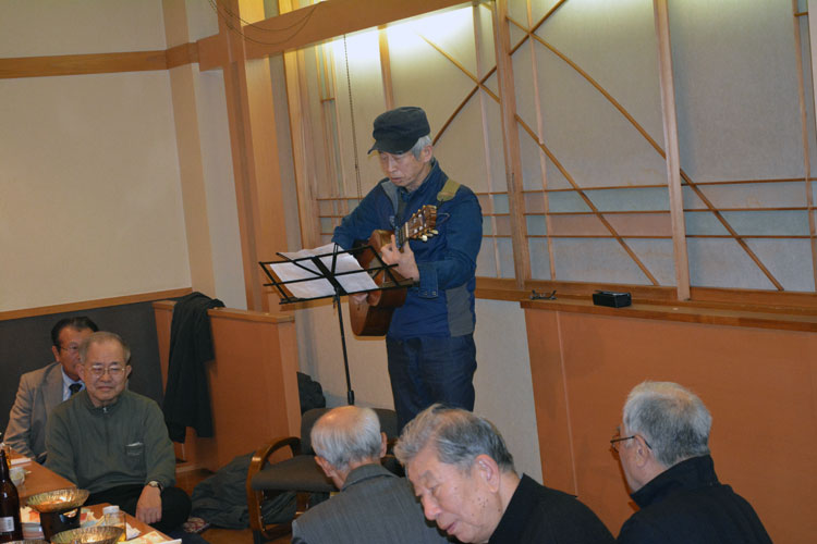 余興として小林君がギター伴奏しながら歌を数曲披露され盛大な拍手を受けていました。 |