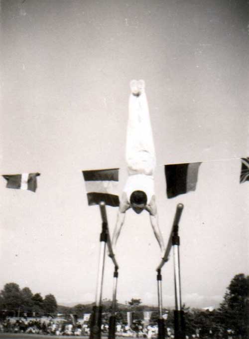 ■ 昭和26年、全国高校選手権で個人の部で出た村上昇は得意の鞍馬で健闘よく3位に食い込んだ。 |