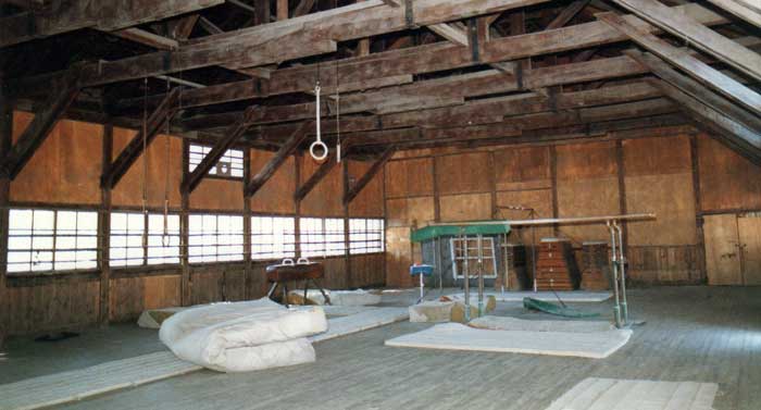 | 裸電球の体操場(旧剣道場で練習が始められた。 |