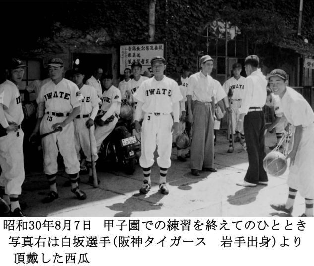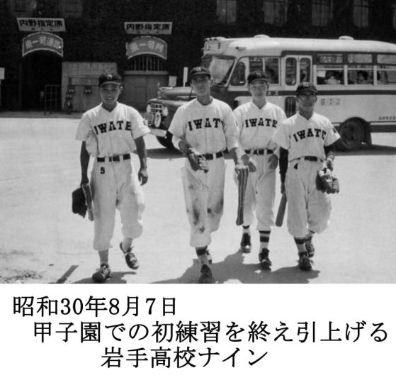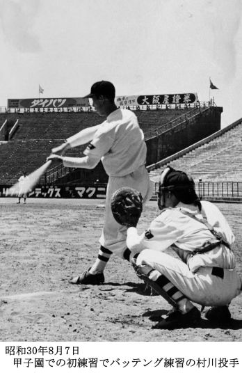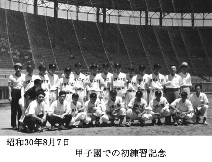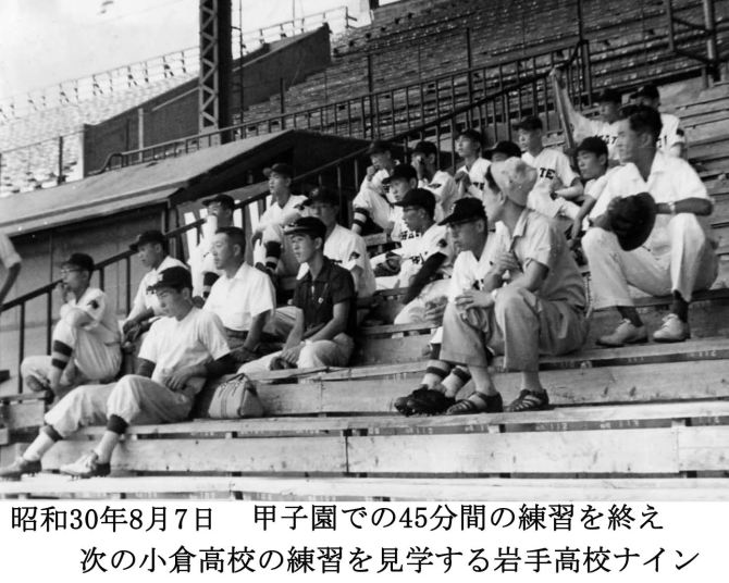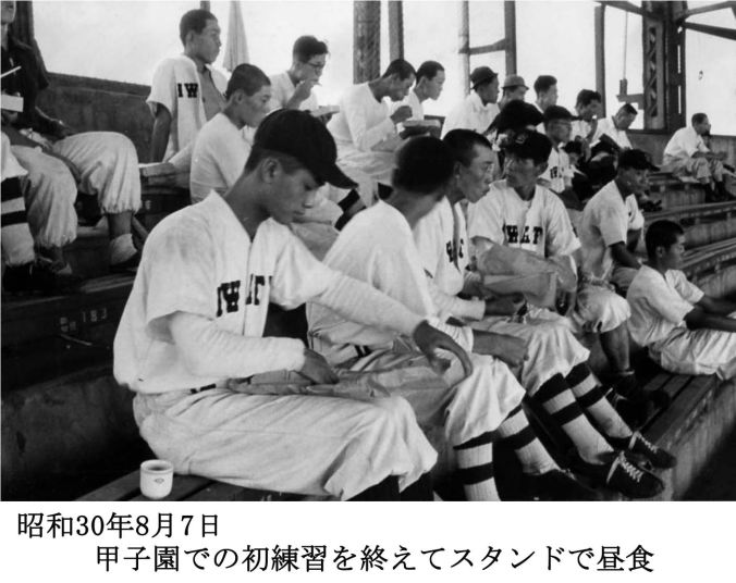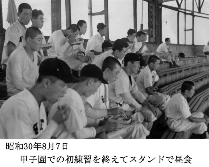| 昭和30年8月7日 初めて甲子園の土を踏み、午前11時30分より甲子園でのはじめての練習をした。 夢に描き、うわさに聞いていた甲子園だったが、高さ80尺、銀色の大屋根、7万人収容の 大スタンドを目のあたりにしてまずどぎもを抜かれたらしく、選手は驚嘆の視線を あちこちに走らされた。 郷里の先輩阪神タイガースの白坂選手(福岡中出身)が練習にひょっこり姿を見せ 「体に気をつけろよ」とあれこれ気を配り甲子園のグラウンドのクセなど有益な話を 聞かせてくれました。 8月8日 8日の朝9から甲子園で軽いトレーニング 初戦の相手は法政二校と発表になる。 法政二校とは妙な因縁があり 6日つばめで下阪した時同じ列車に同乗していた 初めての練習日七日には11時30分からの練習の前、11時から練習していたのが法政二校。 |