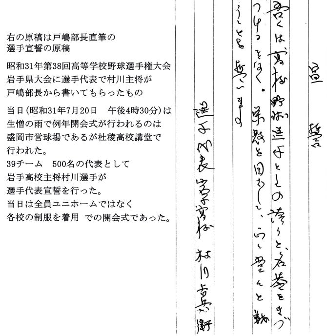 | 野球部の甲子園出場に関しては、後日談も豊富である。大宮市在住のある画家から、 油絵「花と少女」や色紙を贈られたのもその一つだった。 フジバヤシ・サイカンというこの画家は高校野球の熱烈なファンで、毎年心を打たれた出場校に作品を寄贈することにしているのだった。 画伯からの手紙に、つぎのようなくだりがある。 「(前略) 岩手高校には立派な品格がありましたので動かされました。 (中略)勝つ負けるは別です。甲子園へ出てくるもの23、ことごとく 紙一重のちがいです。 運不運によってキマル勝負です。勝っても負けても同じことです。 人間のイノチの光りあるのみです。 岩手、熊本、新庄、芦別、四日市などなら、ボク一生ついてゆかれると思う 学校です。校風です。(後略)」 サイカン画伯から贈られた油絵「花と少女」はいまも校長室の壁を飾り、 岩高チームの活躍を思い起こすよすがになっている。 |