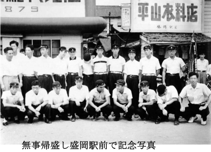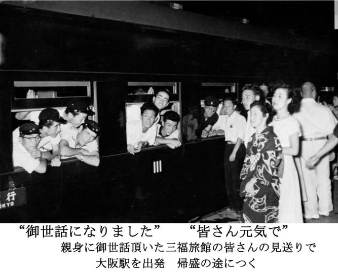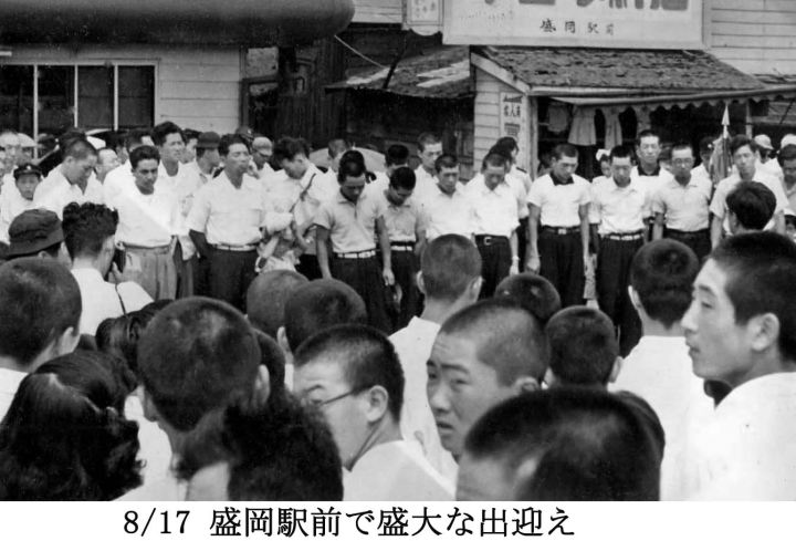 | よく戦った、有難う〞 岩手高ナイン、元気で帰る 甲子園に奥羽代表として出場、健闘した岩手高ナインが17日朝10時30分盛岡駅着列車で 元気に帰ってきた。 駅頭には山中校長、台PTA会長、同校生徒、校友、父兄ら約500名が紫色の応援旗を持って待ち構えていた。 列車が到着、奥羽大会旗を持った田中主将が眼鏡を光らせながら姿を現わすと "よくやってくれた" "ありがとう" と選手をいたわる声がここかしこから起こる。 盛大な出迎えに選手一同も驚いた表情だった。 駅前広場で岩高ナインは山中校長から "よくやった、それよりもうれしいのは甲子園に2週間近くも旅行しながら全員病気一つしないで元気に帰ってきたことだ" と温かい歓迎の言葉を受け、ナインを引率して行った戸嶋野球部長は全員を代表して "甲子園で全力を尽くして闘うことの出来たのも、ひとえに郷土の皆さん並びに岩手県各校 チームの声援の賜物で、感謝しています"と応えた。 なお17日午後5時から盛岡市杜陵クラブで同校野球部後援会主催の岩手高の敢闘を祝う 歓迎会が開かれた。 |