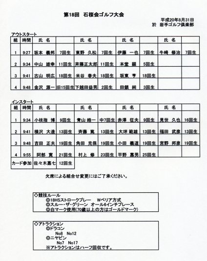| 表彰式終了後全員で校歌2番まで元気に合唱し、楽しかったゴルフ大会無事終了し解散しました。 今回の参加者はカード参加も含めて29名でした。皆さん大会を盛り上げて頂きありがとうございました。 来年の予定は8月30日(日) 場所は岩手ゴルフクラブ新山コース 時期になりましたらこのHPでもご案内する予定ですので多くの同窓生の皆さんのご参加をお願いします。 改めて幹事の大役で大変苦労されました、吉田 正夫さんに敬意と感謝を申し上げます。 来年も宜しくお願いします。 幹事の吉田 正夫さんの連絡先 電話 090-4631-0400 |
