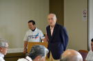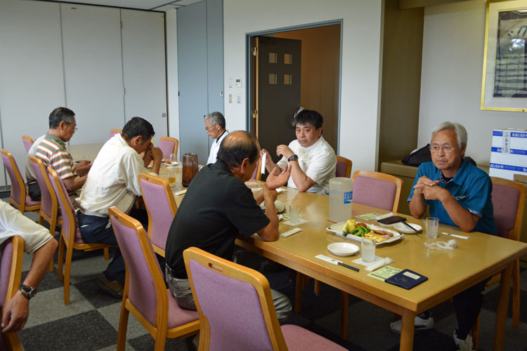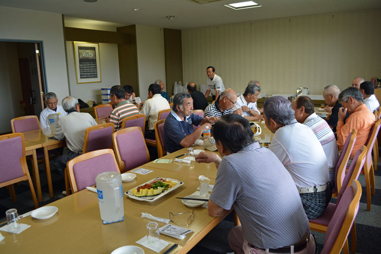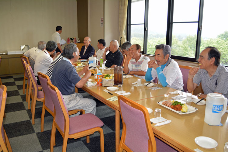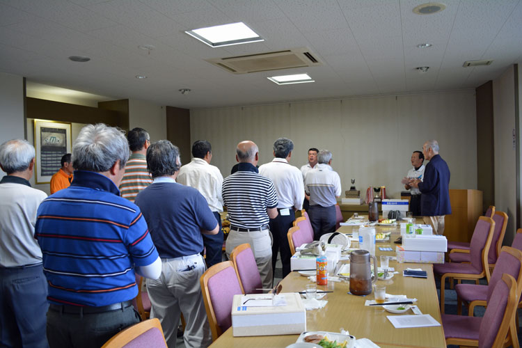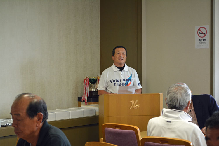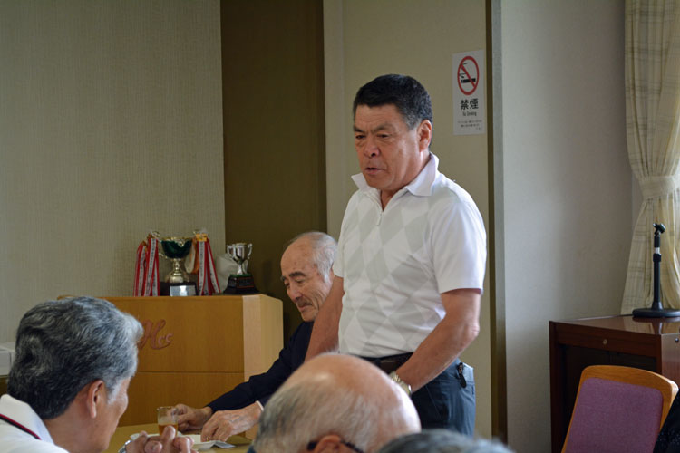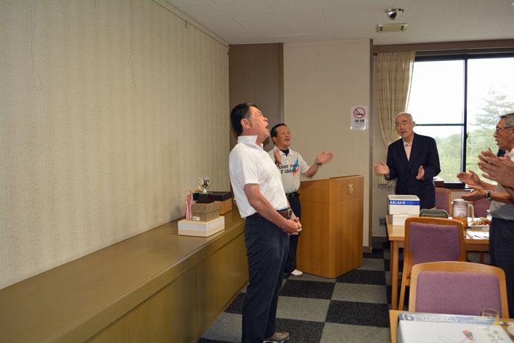 成績発表の挨拶(左)下川原顧問(右)伊藤勢至県議
