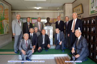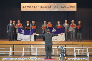 参加した石桜同窓生の熱唱風景 立町小学校玄関の土井晩翠先生の胸像前での記念写真