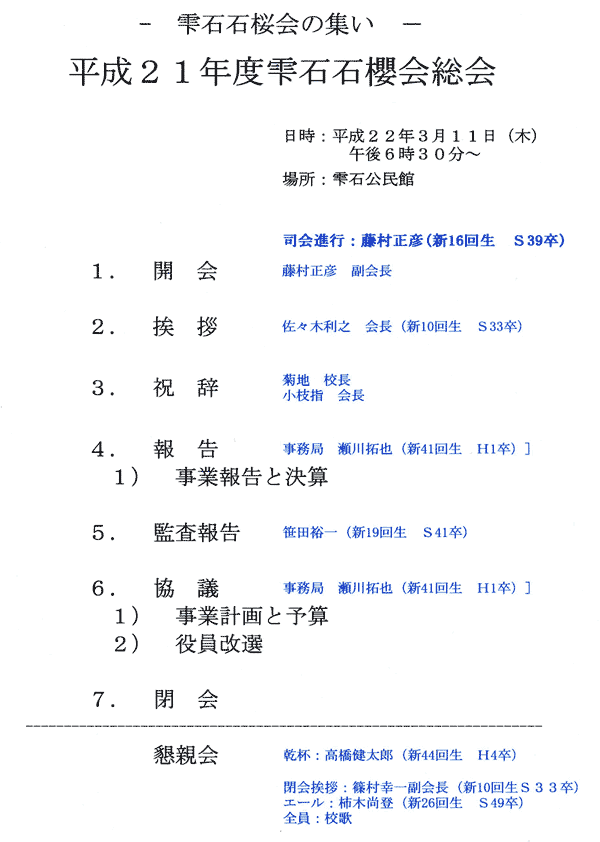 | 平成21年度 雫石石櫻会総会が開催されました |
