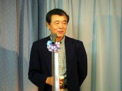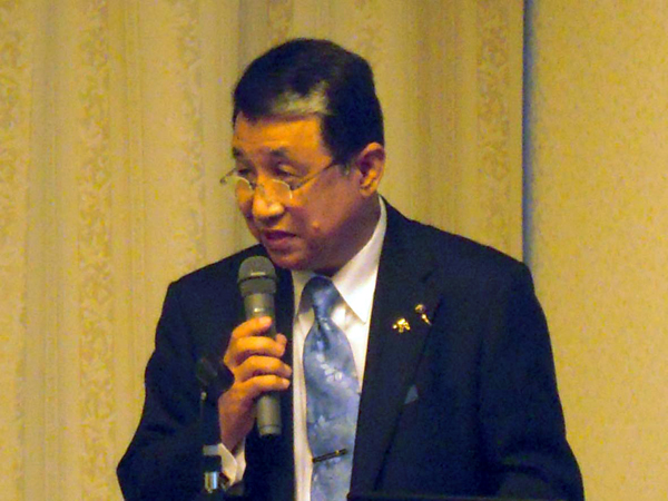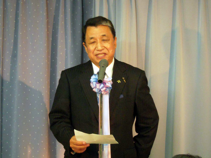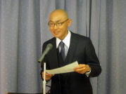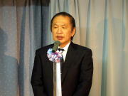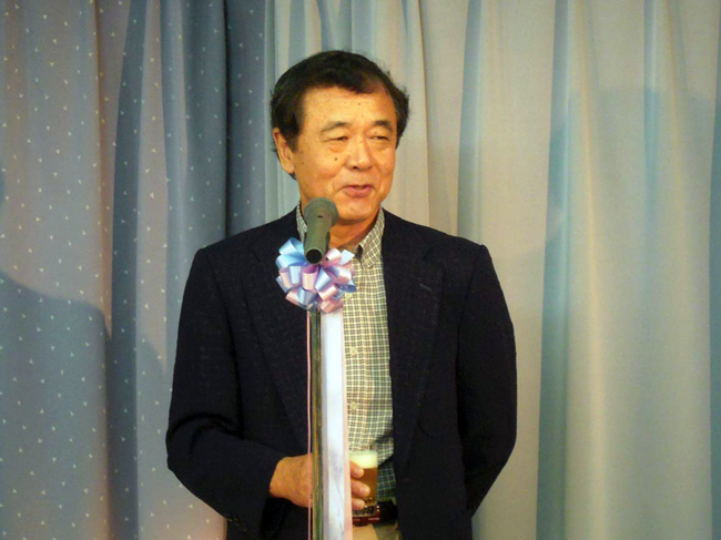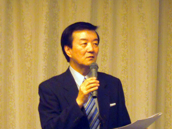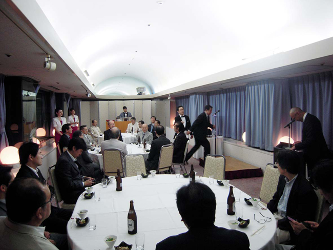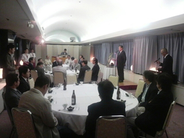 | 懇親会の司会 熊谷幹事 | 懇親会で挨拶する山田会長 | ||
