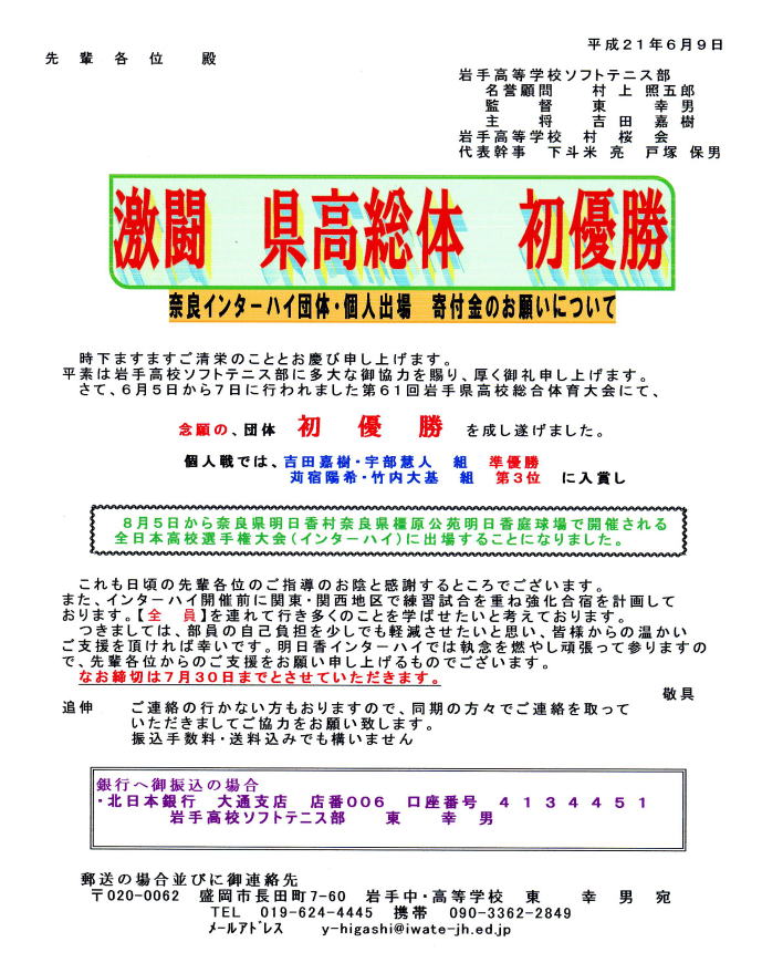 | 第61回岩手県高校総合体育大会(高総体) 平成21年6月5日〜7日 於 北上市 岩手高校ソフトテニス部 団体 優勝 個人 吉田 嘉樹・宇部 慧人組 準優勝 苅宿 陽希・竹内 大基組 第3位 8月5日から奈良県明日香村 奈良県橿原公苑 明日香庭球場で開催される 全日本高校選手権大会(インターハイ)の出場権獲得 |