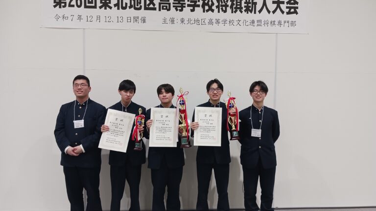 2026年1月5日 / 最終更新日 : 2026年1月5日 sekiou-ob 母校便り 大会史上初の快挙となる表彰台独占!第20回東北地区高校将棋新人大会 12月12日(金)、13日(土)に青森市東奥日報新町ビルで開催された「第20回東北地区高校将棋新人大会」において、囲碁将棋部が出場し、鎌田(高校1年)が優勝、中塚(高校2年)が準優勝、梅内(高校1年)が第三位に入賞しました。同一校が表彰台を独占するのは、大会史上初の快挙です! 優 勝:鎌田(高校1年)準優勝:中塚(高校2年)第3位:梅内(高校1年)第6位:佐々木(高校1年)第9位:柾谷(高校2年)