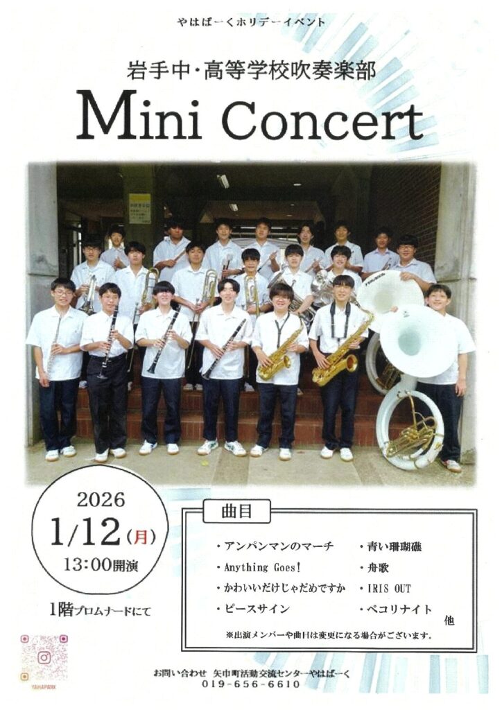 2026年1月5日 / 最終更新日 : 2026年1月5日 sekiou-ob 母校便り 「岩手中・高等学校吹奏楽部 Mini Concert」のお知らせ やはぱーくホリデーイベントに吹奏楽部が出演いたします。 「岩手中・高等学校吹奏楽部 Mini Concert」日時:2026年1月12日(月) 13時開演会場:矢巾町活動交流センター やはぱーく 1階プロムナード入場:無料