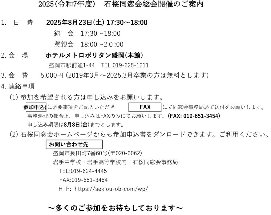 2025(令和7年度) 石桜同窓会総会開催のご案内