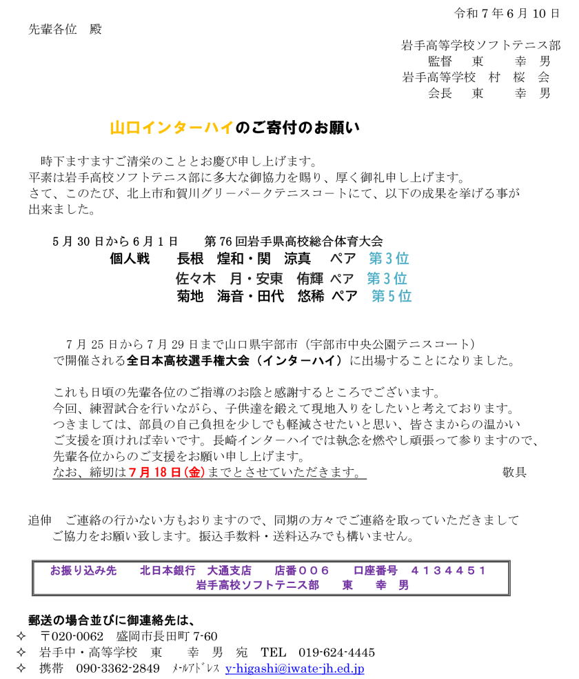 山口インターハイのご寄付のお願い(ソフトテニス部/ソフトテニス部OB会「村桜会」)