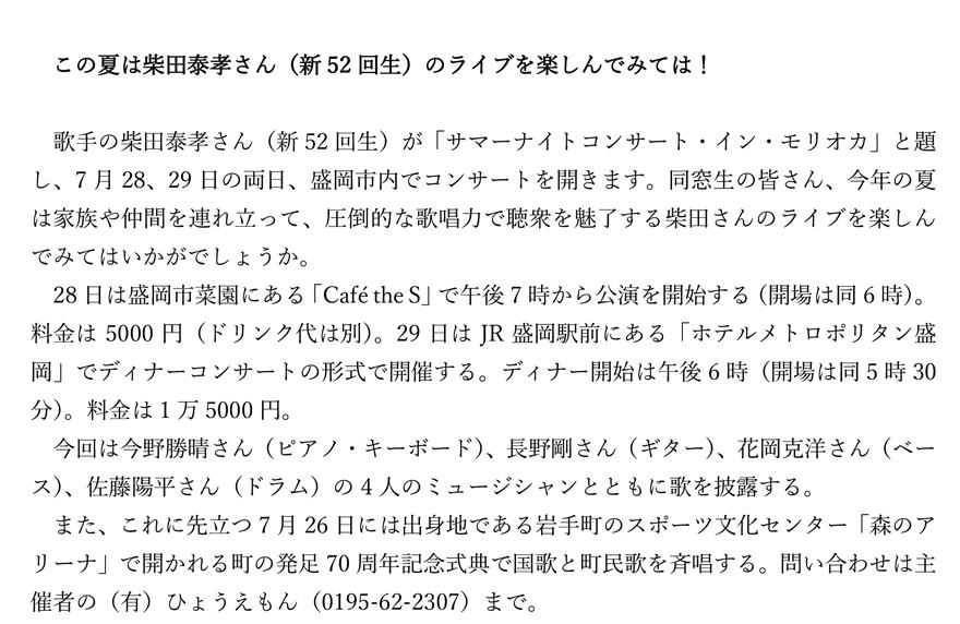 2025年7月21日 / 最終更新日 : 2025年7月21日 sekiou-ob 東京石桜同窓会 【東京石桜同窓会 会員便り 日々三綱~東京支部発】柴田泰孝(新52回生)が盛岡でコンサートを開催します