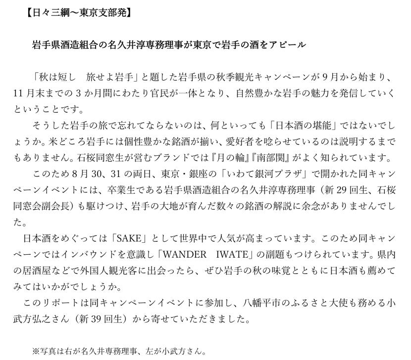 2025年9月14日 / 最終更新日 : 2025年9月14日 sekiou-ob 東京石桜同窓会 【東京石桜同窓会 会員便り 日々三綱~東京支部発】名久井淳(新29回生)が東京で岩手の酒をアピール 岩手の酒をアピール岩手県酒造組合の名久井淳(酒造組合専務理事、同窓会副会長)WANDER IWATE
