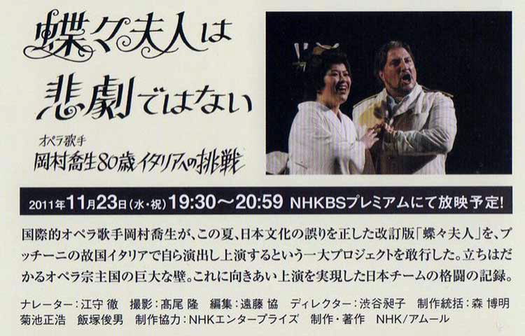 | NHK BS 蝶々夫人は悲劇ではない 〜オペラ歌手岡村喬生80歳、イタリアへの挑戦〜 |